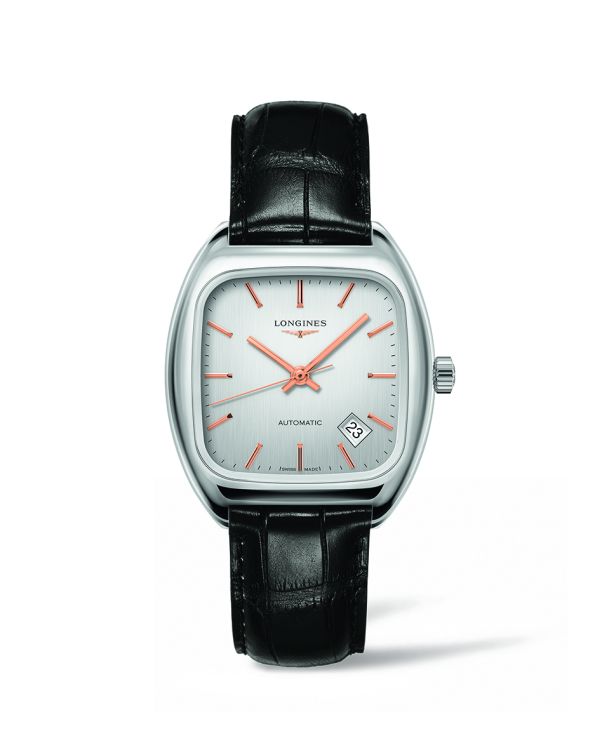The Longines Heritage 1969 ist von einem Zeitmesser inspiriert, der Ende der sechziger Jahre entstanden ist und dessen Neuauflage nun die Heritage Linie von Longines bereichert. Das kissenförmiges Edelstahlgehäuse und das silberfarbene, gebürstete Zifferblatt greifen Stilelemente des Originalmodells auf. Zusätzliche Eleganz erhält die Uhr mit dem eigenwilligen Charakter durch roséfarbene Zeiger und Indexappliken sowie einem schwarzen Alligatorlederband.