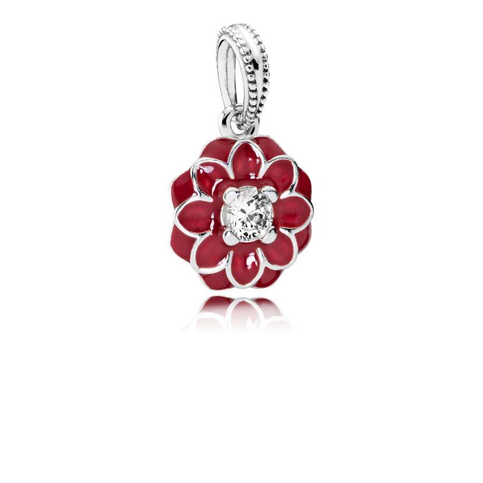 Das bildhafte Charm Orientalische Blüte mit Anhänger aus Sterling-Silber weist gerade Linien und wunderschöne, abstrakte Blütenblätter auf. Der glitzernde Effekt der durchsichtigen, von Hand aufgetragenen kaminroten Emaille mit einem klaren Zirkonia-Schmuckstein vermittelt den Eindruck einer nach einem tropischen Schauer von Regentropfen benetzten Lotosblüte.
