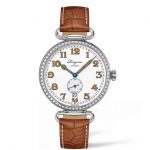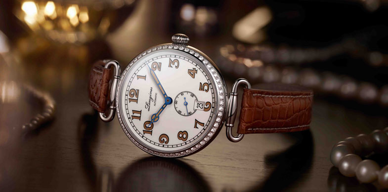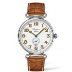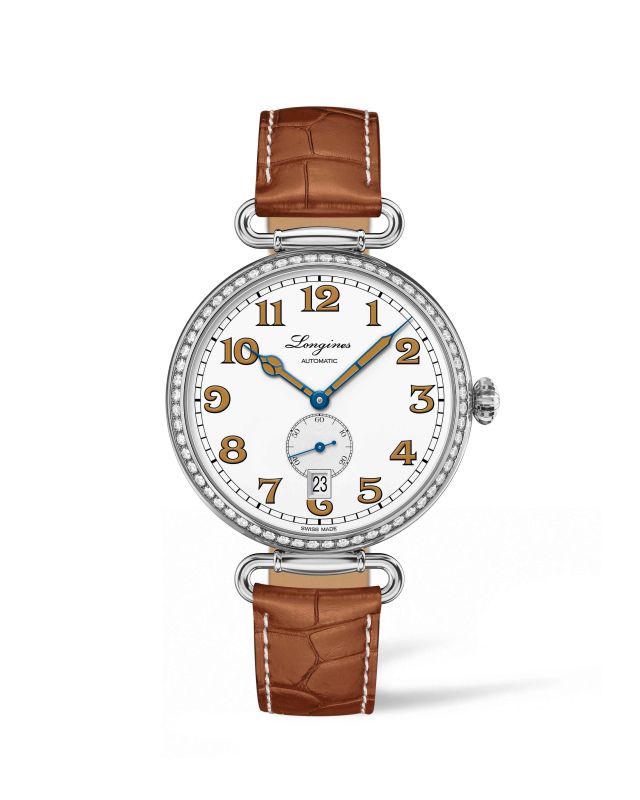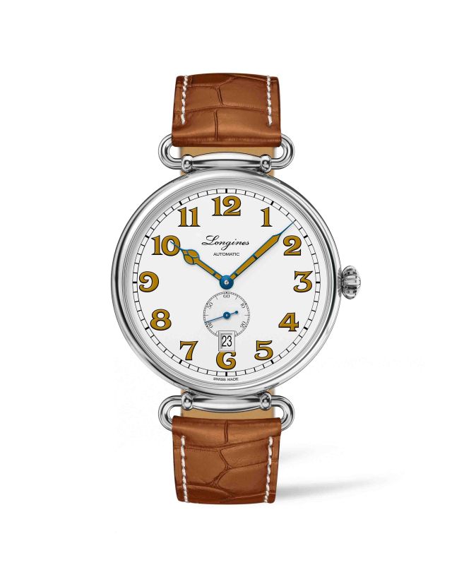 Gebläuter Stahl und honigfarbener Lack verleihen den Stunden- und Minutenzeigern, die sich deutlich vom weißlackierten, polierten Zifferblatt abheben, zusätzlichen Charakter, während der Zeiger der kleinen Sekunde bei 6 Uhr feine Kontraste im typischen Longines Blau setzt. Der edle Honigton ist auch auf den großzügig dimensionierten, aufgemalten Ziffern zu finden, die diesem Zeitmesser im unverkennbaren Design des frühen 20. Jahrhunderts sein ausgewogenes Äußeres verleihen.